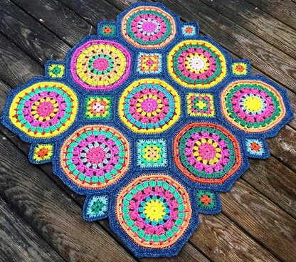Nice size as shown for a baby blanket, baby floor mat, or lap throw, but can be expanded to any size square or rectangle, just leave the granny squares between the circles and the tiny grannies winking along the edges.