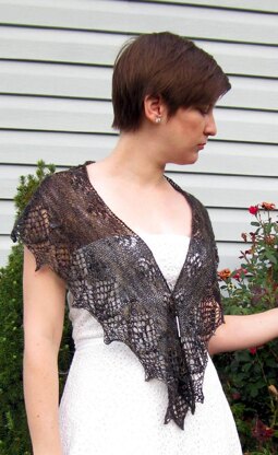 Graciella is a shallow crescent that can be worn as a scarf or small shawl. It is worked from the bottom up beginning with a border of lace scallops and diamonds with nupps. The body is worked in short rows in Stockinette stitch. A top border of small diamonds completes the shawl.