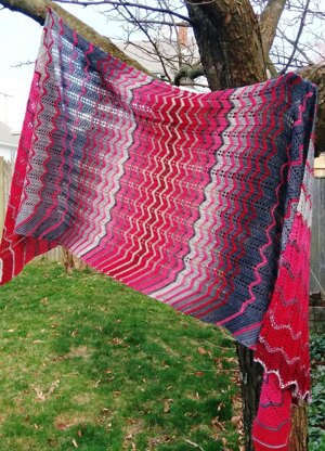 Gradient Play is a rectangular-shaped shawl with a simple lace pattern interspersed with garter stitch stripes; enter in the gorgeous gradients and the resulting shawl is an eye-catching mixture of “rippled” color progression.