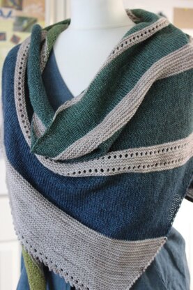 This asymmetrical triangular shawl is perfect for showcasing beautiful hand dyed gradient yarns. It’s a care free knit with sprints of plain stocking (stockinette) stitch allowing the glorious gradient yarn to sing out. Intermittent bands of textural interest are provided with bands of garter stitch and easy eyelet stripes in a neutral colour. This adds interest for the eyes, as well as a change of pace for the knitting. This project offers optimum impact for minimal effort. It’s great for times when undemanding knitting is desired such as for social knitting, watching TV, or when you simply need the comfort of satisfying knitting with little mental effort.