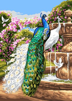 Intermediate Peacock Paradise Tapestry kit by Grafitec. Kit contents: Screen printed 10ct Duo tapestry canvas with DMC thread suggestions