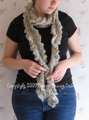 This long, narrow scarf will make a lovely feminine accessory to complement a basic dress or top. The lacy frills look complex, but are really a simple combination of basic crochet stitches, so you’ll be able to create an elegant scarf in just one evening! A variety of looks can be acheived with different types of yarn--from the light airy look of mohair to a more defined stitch using an acrylic yarn.