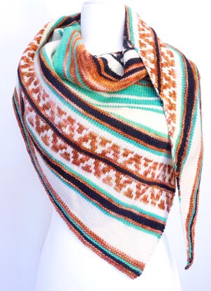 The Grand Junction Shawl is created with a combination of stockinette, garter stitch, and mosaic-colorwork rows in a variety of bold colors. It’s a trendy, cute accessory to wear on a chilly night outdoors. This asymmetrical shawl is worked from one point and increased to the opposite long edge.