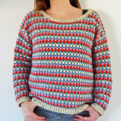 The Granny Rocks jumper is an oversized slouchy jumper with a wide neckline that you can throw on during those chilly days. It features 5 colours of playful granny stripes, and you have the option to float your yarns up the side to eliminate sewing in all those ends!
