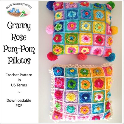 Crochet these two colorful Granny Rose Pom-Pom Pillows. This instantly downloadable pattern will teach you step-by-step how to complete and join two-color granny rose squares and includes information on how to make two different fun pom-pom borders. The 20-page pattern includes plenty of photos, as well as, several links to videos for extra added assistance. Additionally, you'll find a one-page abbreviated version of the granny rose square.
