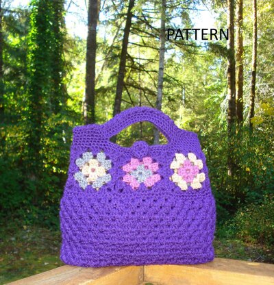 Start with six granny square motifs that are joined together to form a ring. Crochet around the top of the ring for a few rounds and then create an opening for the handles. Crochet around the bottom of the ring and continue the body of the bag in the granny square pattern. Crochet the base and attach to bag. Attach a crocheted button and your clutch bag is complete.