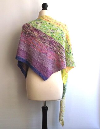 This boomerang shaped shawl uses a ten skein mini skein pack from Emma’s yarns. The colors shift from root to fruit, with an overall bobble pattern on stocking stitch.