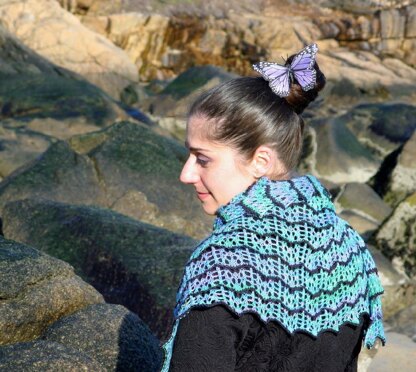 Graphium is curved asymmetrical triangle worked from narrow tip to broad end. Bands of lace in a colorful hand-dyed yarn are separated by narrow stripes of black. The lacy black edge is worked as you go, using basic intarsia techniques.