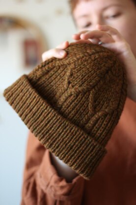 It is a sister design to my Grass Whispers Pullover, which features a similar pattern of cables and slip stitch ribbing on the mock neck. The beanie is worked bottom up in the round.