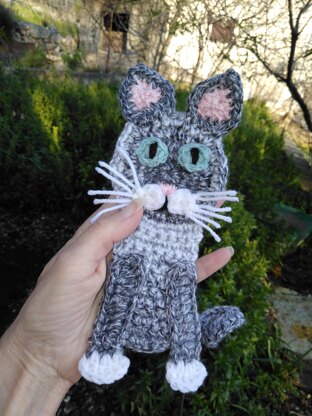Crochet gray cat applique is nice decoration for kids clothes, bag, blanket, whatever you want... Can be hung as decoration on the wall.