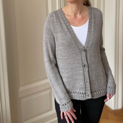 Grea Cardigan is a classic V-neck cardigan with long sleeves. Primarily worked in Stockinette Stitch, a subtle slip stitch pattern embellishes the body and sleeves just above the hem and cuffs. Buttons allow the cardigan to be worn closed. The cardigan is worked top down.