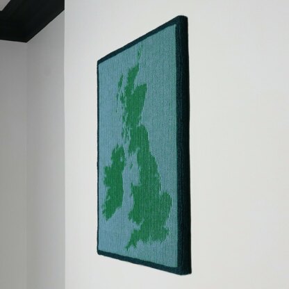 The map in the photos was made using Stylecraft Special DK but you can use any yarn and the illusion will still work. Using DK, the size is approximately 67 cm x 80 cm (26” x 32”). Using other yarns might change the overall size. I used about 400 metres (440 yards) of each of Cloud Blue and Kelly Green. Extra yarn is needed for the border.