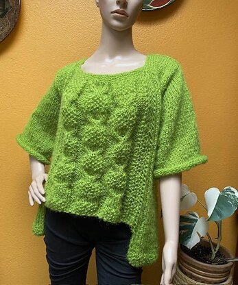 Designed by Adriana Petre Green Bliss Jumper Pattern Rating: Easy/Intermediate Asymmetrical, dropped shoulders, ¾ sleeves , square neck. This jumper is knit in seeds, cable and stockinette stitches. It is an easy to follow pattern for beginners/intermediate knitters. A quick description : Start with the middle , then, work the sides , back and sleeves. Size: L/XL Measurements without stretching: Top to bottom back: 25”, 64 cm Underarm flat measurements , not around: 23”, 58 cm