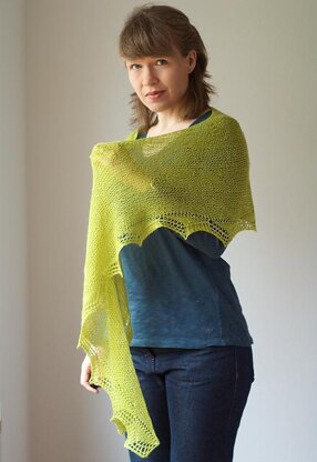 Green and light – that means green lights for everyone who would like to knit their very first lace project! It starts with simple garter stitch on the bias, the lace border is knit on last. The result is a classically elegant crescent shaped symmetric shawl, light as a feather and warm and comfy at the same time. The shape is achieved by stacking two geometric shapes onto one another, all in garter stitch to keep it simple. The attractive lace edging is attached perpendicularly as the final step.