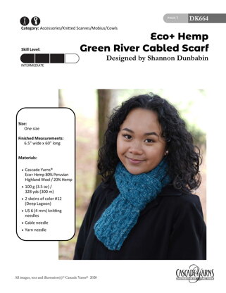 Green River Cabled Scarf in Cascade Yarns Eco+Hemp - DK664 - Downloadable PDF is a free Intermediate Knitting pattern by Shannon Dunbabin, available as a Downloadable PDF and includes instructions in English. Super fun to make, this pattern could be your next masterpiece!