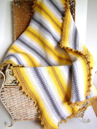 A simple pattern with spectacular results! Beautiful heirloom project to make for any new baby’s crib or stroller. The crochet stitch reminds me of fine linen and the picot edge provides nice detail. Shades of grey and yellow translate wonderfully for any baby boy or girl. Easily change up the colors, edging and size to please you or any new mommy.