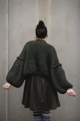 Grey sheep bobble jacket is above hip length knit with long balloon sleeves and is worked top-down. The jacket has bobbles in the top of both sleeves. Sleeves and the body are worked in Fisherman rib stitch. Sleeves are without cuff and body without hem. Because the sweater body is worked straight it can be easily made longer and of course, more yarns should be purchased. Grey sheep bobble jacket is above hip length fashionable cardigan that fits well with long shirts, dresses, and other comfortable casual clothes.