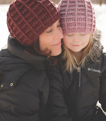 This is a PDF crochet pattern for a textured beanie in 8 sizes, from newborn to large adult.