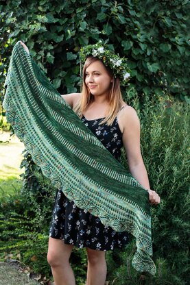 „Gryfno Frela“ (Silesian dialect for „Pretty Girl“) is a long, narrow shawl worked top down from the nape out, featuring a two-color brioche pattern.