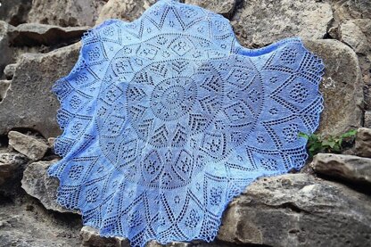 A circular shawl, knit from the center point out, with tiered bands of floral and garland lace motifs. The pattern contains charts only for the lace patterning. The pattern is cast on onto DPNs, and you will then switch to longer circular needles as the stitch count increases. The edging is completed with a crocheted edging, which is simple to work and yields a lovely open/lacey result.