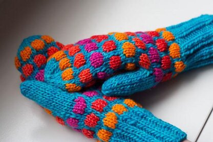 Goody, goody gumdrops – the polka dots on these cozy mittens are such fun. Go crazy with colour here and knit every row of gumdrops a different color, or be subtle with tone on tone. There is a size for everyone: babies to grandpas. Instructions for both traditional mittens and fingerless gloves are included.