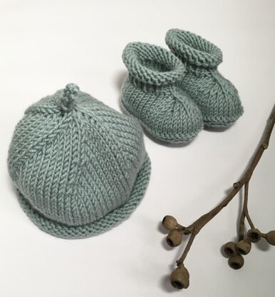 This hat and booties set will make the perfect handmade baby shower gift. Quick and easy to knit, they feature matching rolled edges. The hat has a spiral decreasing pattern in the crown and a cute little apple core. The booties have thick garter stitch soles for added warmth and ribbed ankles to keep them on little feet.