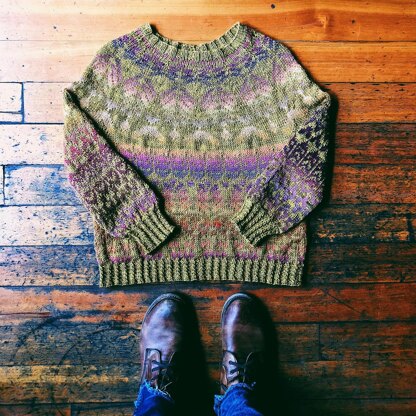 Guthrie is a round yoked sweater knit seamlessly from the top down with an all-over colorwork design and 3/4 length sleeves. The bottom and sleeve hems feature a simple cable ribbing pattern. Instructions are given for cropped or full body length versions, and the sleeves can also be knitted to a longer length if desired.
