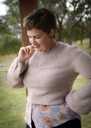 This statement sweater is worked top down with a seamless circular yoke and a pretty mesh lace design. This cropped sweater has waist shaping and is designed to be fitted in the shoulder and body for a flattering fit while the bishop sleeves give a soft and feminine look to this modern take on a vintage silouhette. The bishop sleeves are shaped without increases but rather use needle sizes to increase the width of the lower sleeve, this results in the fabric of the lower sleeve being looser and drapier than the rest of the sweater for a light and airy sleeve that billows beautifully around the hand.