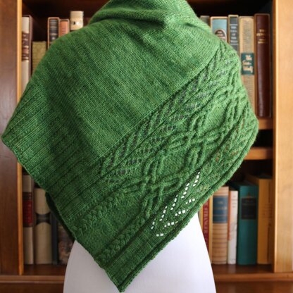 Based on the book A Morbid Taste for Bones by Ellis Peters, Gwytherin is inspired by Sioned, a woman who is steeped in medieval Welsh tradition yet fiercely independent. This shawl mixes a Celtic inspired cable and delicate lace with a modern asymmetric shape. Suitable for everything from a stroll in the countryside to diner in the manor, this elegant and easy piece will become a favorite wardrobe staple.