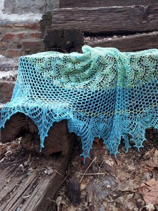 Worked top down, this crescent shaped shawl with optional beading, has simple faggoting running in lines down the main body of the shawl, representing the creek and waterfall, the zig zag of water hitting the stones and creating spray and the bubbles and foa