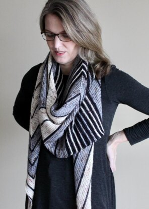 There’s nothing better than a great big squishy garter stitch shawl to wrap yourself up in on a cool day. This triangular shawl starts with just a few stitches and is worked sideways with a centred double decrease stitch creating a sideways ‘spine’ effect. The colour changes keep it interesting and the garter stitch knitting is simple and soothing. The pattern is written for Miss Babs Yummy 2-Ply but you can choose three colours of any sock or fingering weight yarn to make it your own. It is also shown here in Hedgehog Fibres Skinny Singles (grey/black/off-white).