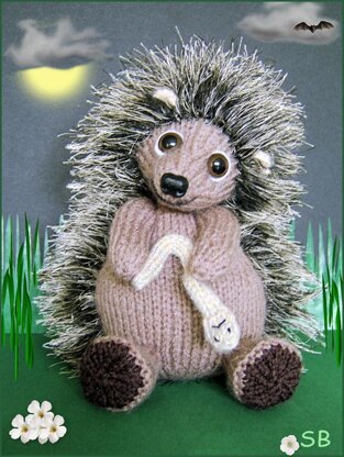 A friendly little hedgehog and his juicy worm! Halen stands 6 1/2 inches high Knitted flat on 3 & 4mm needles using DK or equivalent yarns and fun fur yarn. Super quick knit, with no complicated shaping or stitches. Clearly written and easy to follow pattern, with photographs.
