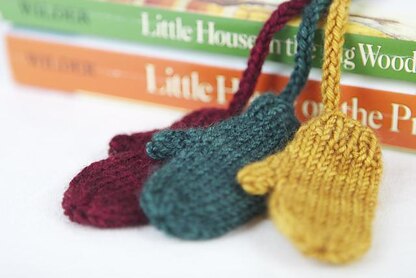 Needles: US size 1 Gauge: 8 sts per inch in stockinette stitch Measurements: Mittens: 2-inches in length each Cord: 10-inches in length, perfectly sized to be used as a bookmark with the classic Little House on the Prairie books
