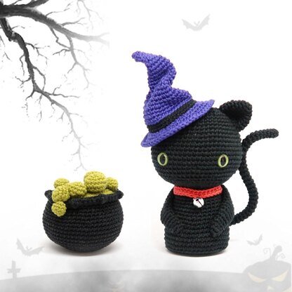 MEASUREMENTS With the yarns used in this project, the Halloween Cat doll measures 20 cm (7.8 inch) tall, 15 cm (5.9 inch) wide. The cauldron measures 9 cm (3.5 inch) tall and 10 cm (3.9 inch) wide.