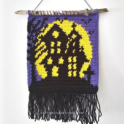 The tapestry crochet Haunted House Wall Hanging is a fun home decor project for Halloween.