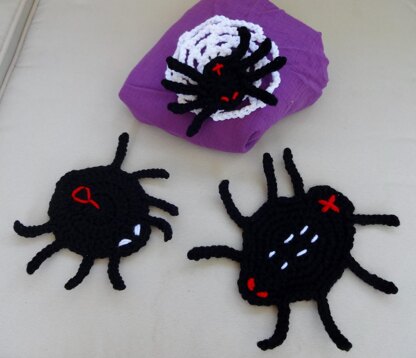 Three in one for Halloween!  Set of 3 separate detailed crochet instructions with photos for Spider and Web, Spider Coaster/Mug Rug and Large Scary Spider Coaster/Mug Rug/Trivet. Fun to make and suitable for beginners with some experience.