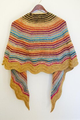 This is a semicircular shawl that utilizes yarnovers along the edge on every row to create a longer wingspan. It is worked with a solid yarn for the master color (MC) and a long strand variegated yarn for the contrasting color (CC) but would also look great using two solid colored yarns.