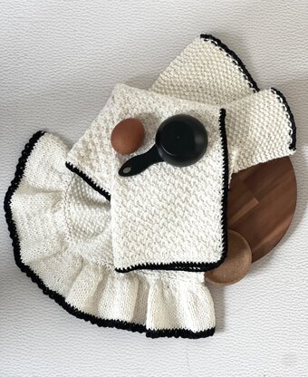 This cute hand towels are only in knit and purl stitches, Knit 2 stitches together is used to make the ruffle. For the one with no ruffle, the knitting pattern is written without the black edge, but optional you can use black yarn to do a single crochet row around the edges. Yarn-Any worsted Cotton yarn. 430 yards. Needles-US7(4.5mm) Gauge 18st/28rows/4’’