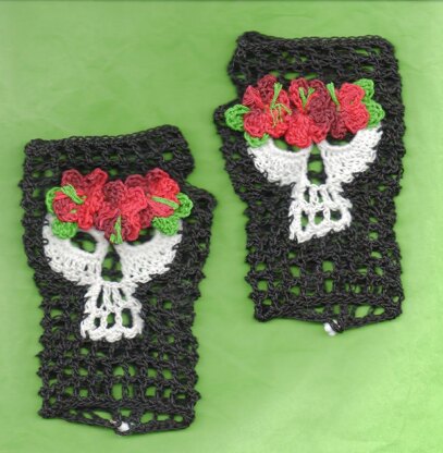 I wrote this pattern to celebrate Frieda Khalo's Birthday. There are pictures of almost every row. The skull motif is made first.The fillet crochet glove is attached to it row by row. The triangular shape of the skull is utilized to shape the glove. This pattern is written in US crochet terms