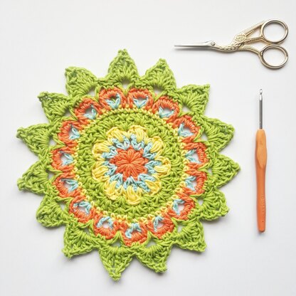 Happy Days Mandala is a cheerful project that can be done with scraps of yarn in no time.