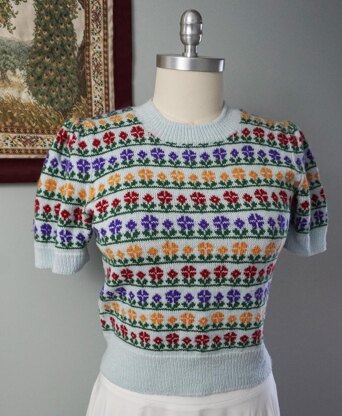 Happy Flowers is inspired by a vintage pattern from 1947 titled Flowers Gay. I took the colorwork chart and the basic silhouette, and designed this sweater from scratch with an aim to be size inclusive.