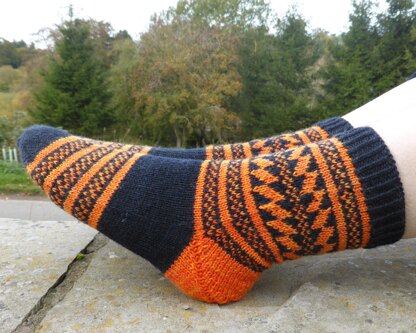 The pattern has been written for toe up. Full written instructions and the colourwork is also charted. You never need to strand over more than 3 stitches - suitable for newbie stranded knitters.