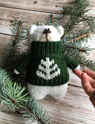 The body is knitted in the round. Legs, arms, ears and face are knitted separately and attached to the body when finishing the project. Pattern includes instructions for the bear and for his sweater. The sweater is knitted in the round from the top down, and embroidered using duplicate stitch technique. Skills required: knitting in round, decreasing and increasing stitches, embroidery skills.