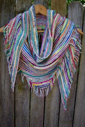 This fun scrappy shawl used a variety of fingering weight yarns and bases, ranging from