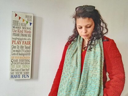 The Harba Wrap has a scaly appearance because of the V-like cable pattern across the fabric. This wrap is worked in two mirror-image halves, and the pieces are grafted together seamlessly in the centre.