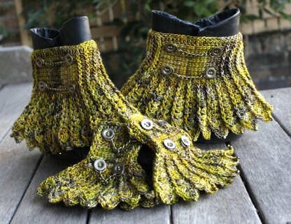 Hardware Heaven is a Steampunk inspired Victorian style set. Incorporating a Waist Cincher, [Statement Neck Piece][1], Wrist cuffs and Boot spats, all finished off nicely with chain and hardware. This is the pattern for the boot spats and wrist warmers. There will be a separate pattern for the Statement Neck Piece and another pattern for a Corset style belt/Waist cincher.