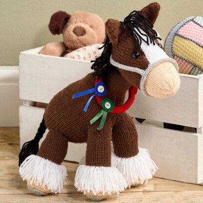 The Shire horse is a workhorse, carrying out tasks such as farm work and barge towing, although this knitted horse isn’t quite so heavyweight! Harley the Shire Horse has horseshoes, reigns, a plaited tail, and a collar of rosette awards. This pattern features chart-free intarsia to make the white flash on the head. Designed by Amanda Berry @fluffandfuzz, the horse is knitted in acrylic DK yarns on single pointed needles (not in the round). DPNs are used to knit i-cord tubes for the reins and collar. Harley is 29cm tall (seated, with ears pricked up). For confident beginners and above, other techniques used include casting on and off, knits, purls, increases and decreases, and seaming to finish.