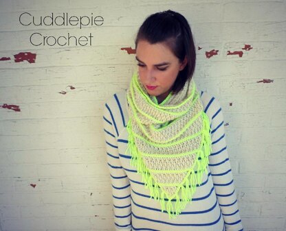 To make this piece I used two cream skeins and one neon yellow. Make this a double wrap as shown, or a single loop cowl style! This pattern matches my Harlow Infinity Slouch Hat.