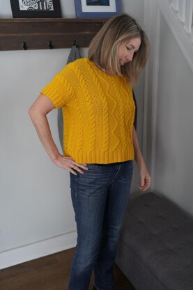 Seed stitch and symmetrical cables grace this slightly cropped, boxy pullover. Worked from the top-down beginning with a provisional cast on of the back and sleeve stitches. Front stitches are picked up from the provisional cast on and a few short rows are worked to shape the shoulders. Once the underarm is reached the front and back stitches are joined to work in the round. Completely seamless with minimal finishing, this cute pullover will jump from needles to body in very short order. Instructions for the stitch patterns are provided in both written and chart format.