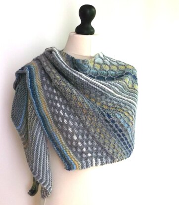 This slightly assymetric triangle shawl is worked sideways. Garter stitch and slip stitch patterns create a striking garment.